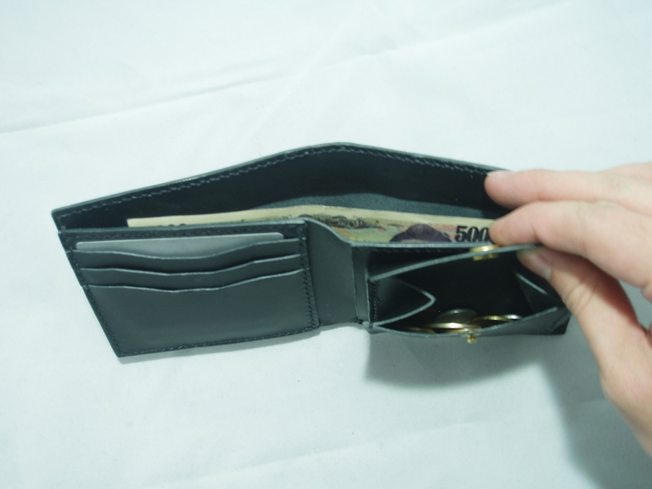 基本構造は前のイタリアンレザー二つ折り財布とほぼ同じですが、こちらはイタリアンレザーのなかでも高級なリオショルダーというものを使用し、小銭入れ部分を若干大型化させています。