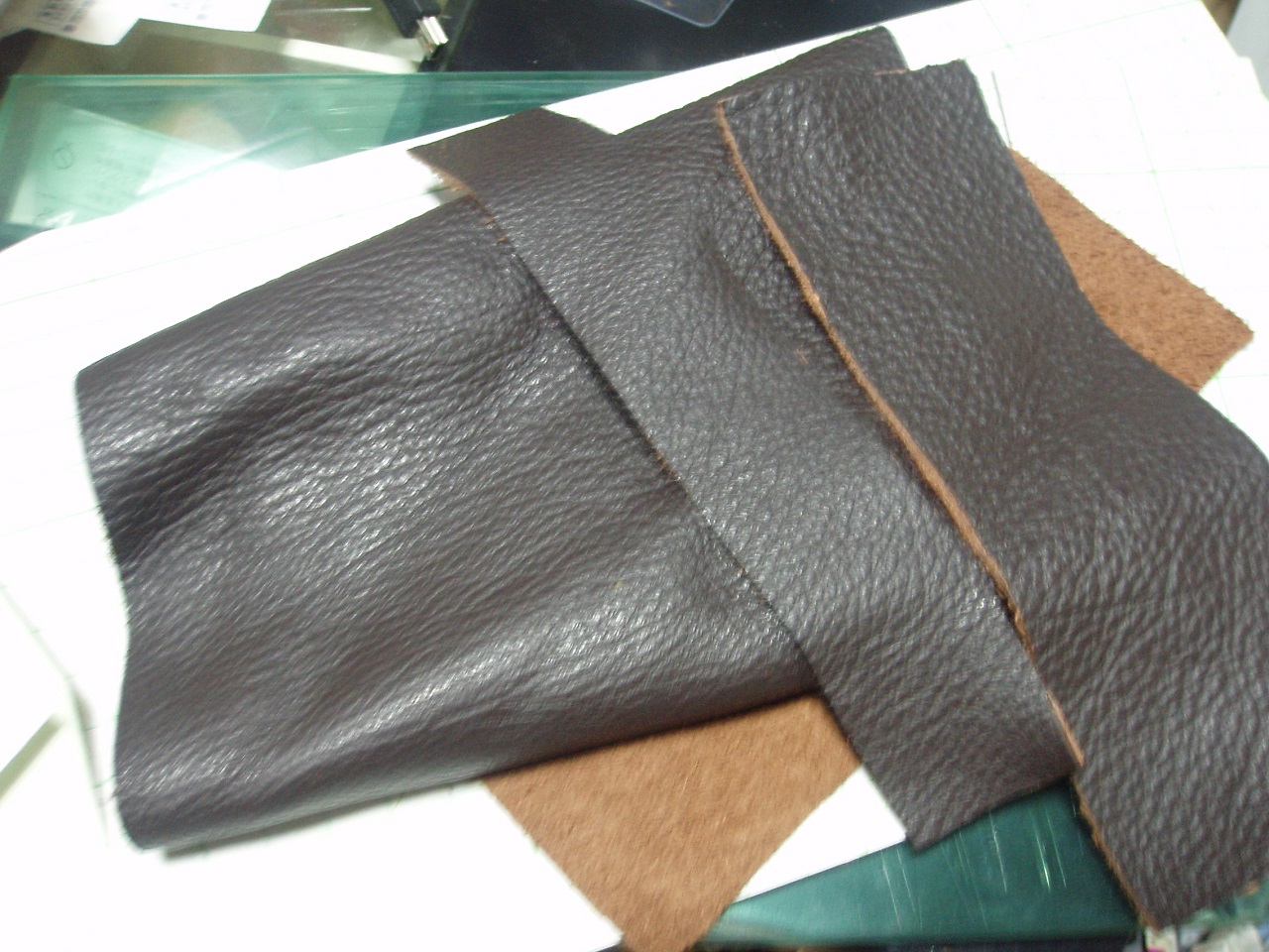 写真はパーツごとに切った物で、床面(裏面)をトコフィニッシュで磨いて専用接着剤で張り合わせた後これを迷惑にならない様、日中に時間が出来たときに縫い穴を開けた後仕立てていきます(以前も書いたけど穴開けは結構うるさいです)。この革はクロムなめしと言うもので、柔らかくてある程度なら表面は水を弾いてくれます。高級レザーのような質感はありませんが、こちらはこちらで使い勝手は良いと思います。作る方は柔らかくて綺麗に切るのが難しいですが。