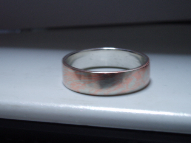 依頼の案が固まったので、指輪を製作しました。今回はランダムタイプの模様の新木目金リングです。なぜランダムと呼んでいるのかというと、作っている私自身でも完成まではっきりとは模様が分からないからです。しかも、焼きあがるまでの間、一度の失敗も許されません。その代わり、本当に持ち主だけの模様のリングが出来上がります。リスクはありますが、いい模様が出来ると作ってても嬉しくなります。