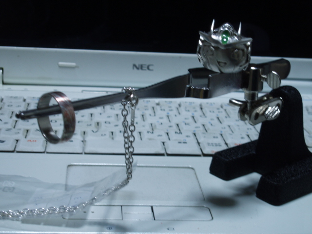で、今回御徒町まで行って買ってきたのは、依頼でペンダントのチェーンも頼まれたのでパーツごとに買ってくっつけたのと、ロウ付けに使う固定する道具です。写真のような感じではさんで使います。土曜にやってる店があってよかった…。