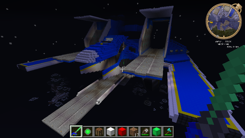 1ブロック1mの壁はこのサイズでも厚かった…。しかしトレミーより大きく、このゲームの世界で作れるものとなると、あとは連邦(00)の艦かガデラーザ位ですね。もう疲れましたけど、達成感はありました。