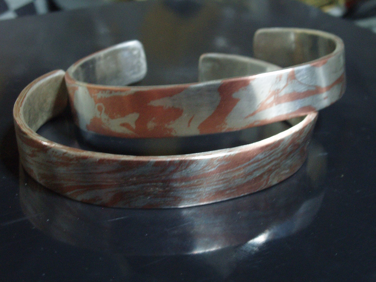 GWの時に妹の誕生日プレゼントに渡した新木目金バングルです。ここまででバングル4本紹介しましたが、見てのとおり全て模様が違います。大雑把になら模様をコントロール出来る様になりましたが、やはり全く同じ模様は作れないため、これも世界で一組だけのものになります。