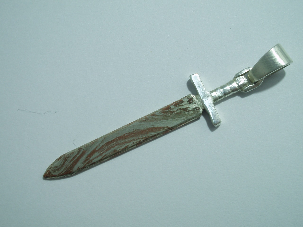 以前作った新木目金ソードを元にペンダントとして作ったもので、剣としての造形をそのまま最小限に、マーブル模様を最大限目立たせるように作っています。