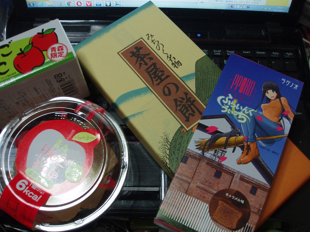 実家から帰ってくる際、自分用の土産も買ってきているのですが、こんな感じになっています。漫画やアニメが好きな方ならあっさり私の実家がどの辺か分かるパッケージのおやつがありますね…