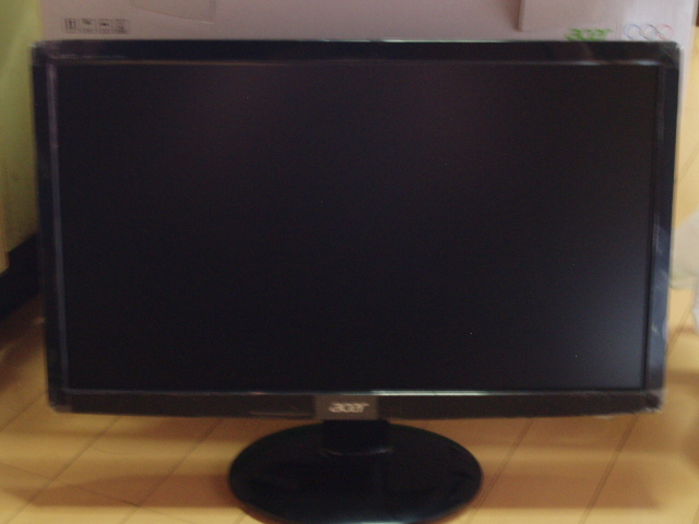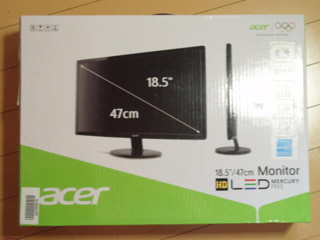 今回購入したのは、acer(エイサー)というメーカーの18.5型のバックライトがLEDのものです。このメーカーにした理由は単純で、友人に薦められたから。しかし、今の液晶ってすごく薄いんですね。多少大げさですが、ノートのモニターとそんなに変わらない。当然と言うか、いままでのノートのモニターより綺麗に映っています。繋げてるのはアナログのケーブルのはずなんですが。