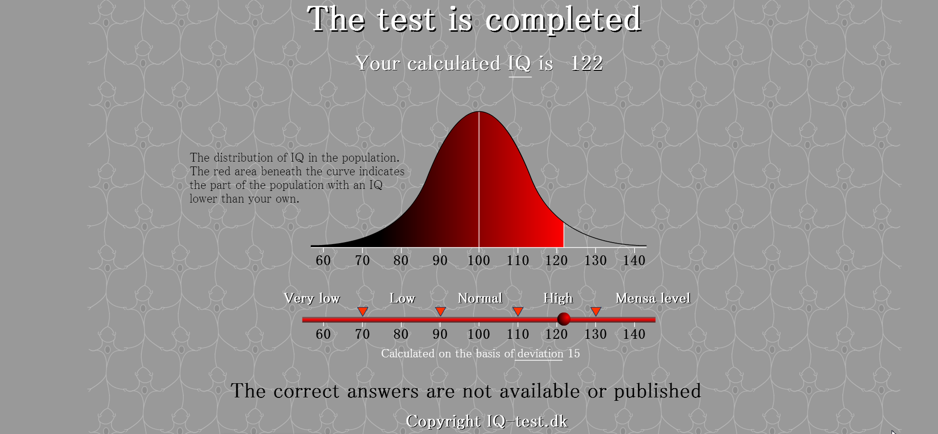 ネットで調べ物をしている最中にIQテストにたどり着きました。何年ぶりかにということで挑戦してみたところ、122でした。テストの度大体これ位の数値なので、私のIQは120以上はあるということでいいのかな?