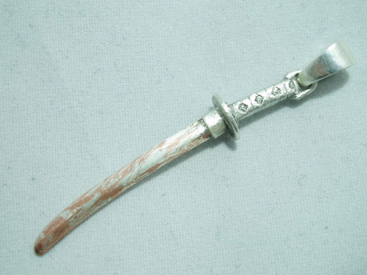 刀身を新木目金に据えた日本刀型のペンダントトップで、必然的に細身の折れやすい造形になるためバチカン以外の銀部分をシルバー950にすることで強度を向上させています。実際の日本刀よりは刀身の幅が広いのは強度向上と模様を見せやすくする目的から来ています。写真からは分かりづらいですが鍔は丸型です。