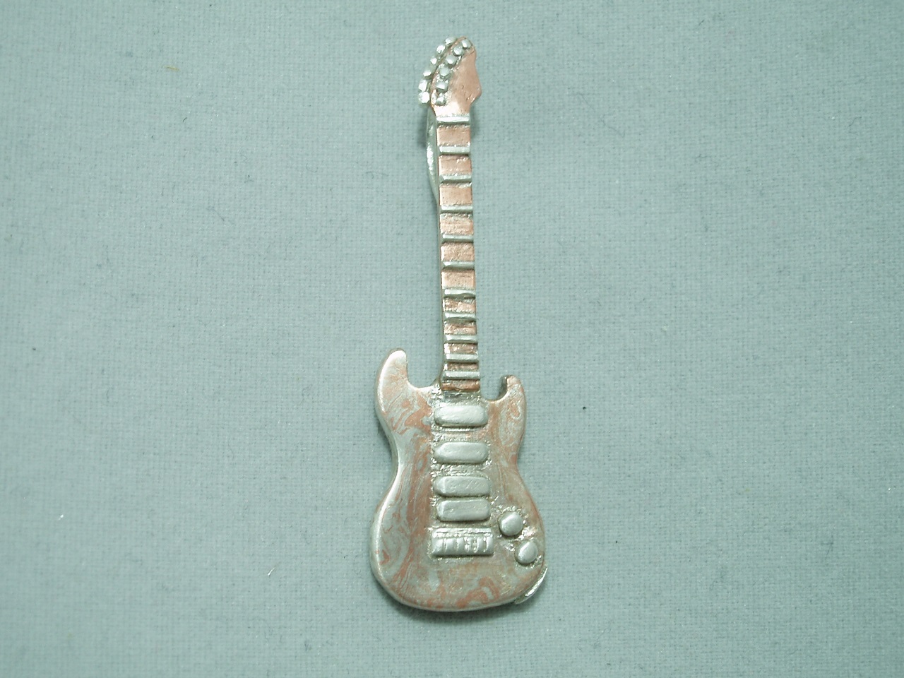 新木目金を使った本格的な造形の販売品を作るというコンセプトで製作したもので、ストラトキャスタータイプのエレキギターをモチーフに銀、銅、新木目金の三種の表情を見ることが出来る品です。