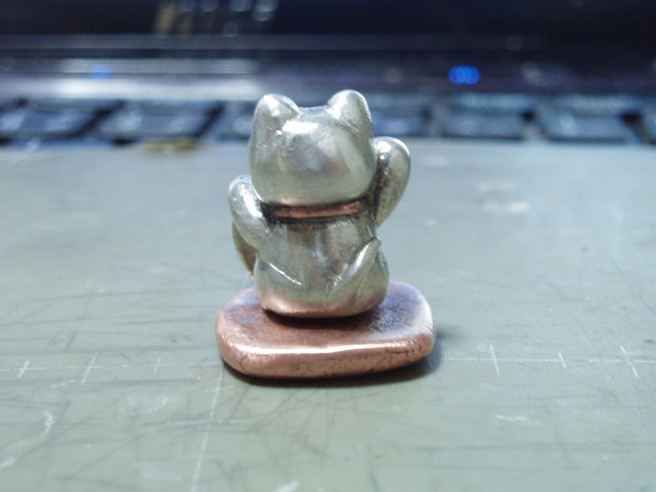 縁起物として新木目金製の招き猫を作ってみました。ケチるわけにもいかないので、肉抜き無しで銀粘土をフルに使っています。純銅のお座布団付き。